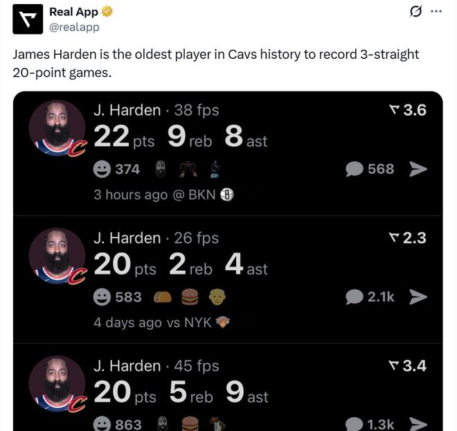 凭借这样的表现,哈登一口气刷新数项纪录,首先是36岁188天的哈登已经连续三场交出20+得分表现,创造骑士队史最老纪录。