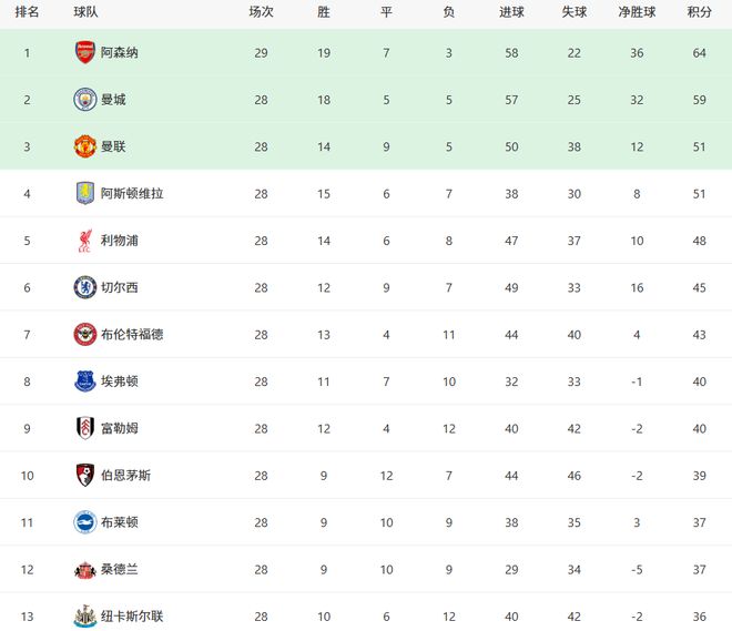随着阿森纳2:1切尔西 英超最新积分榜!曼联冲到第3 热刺濒临降级
